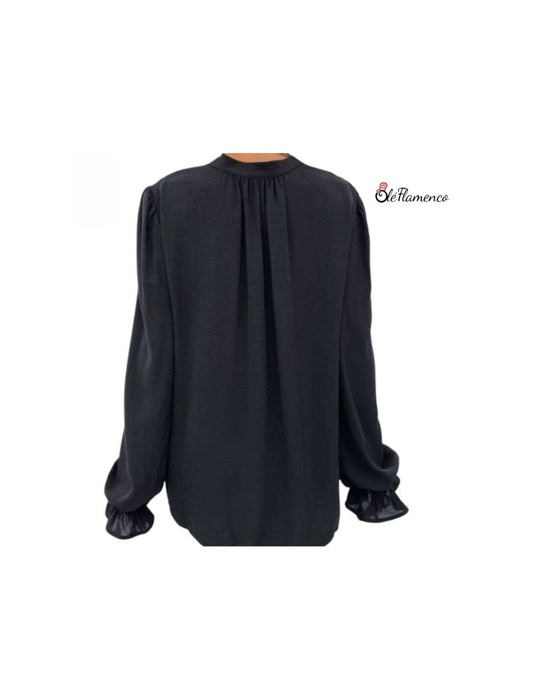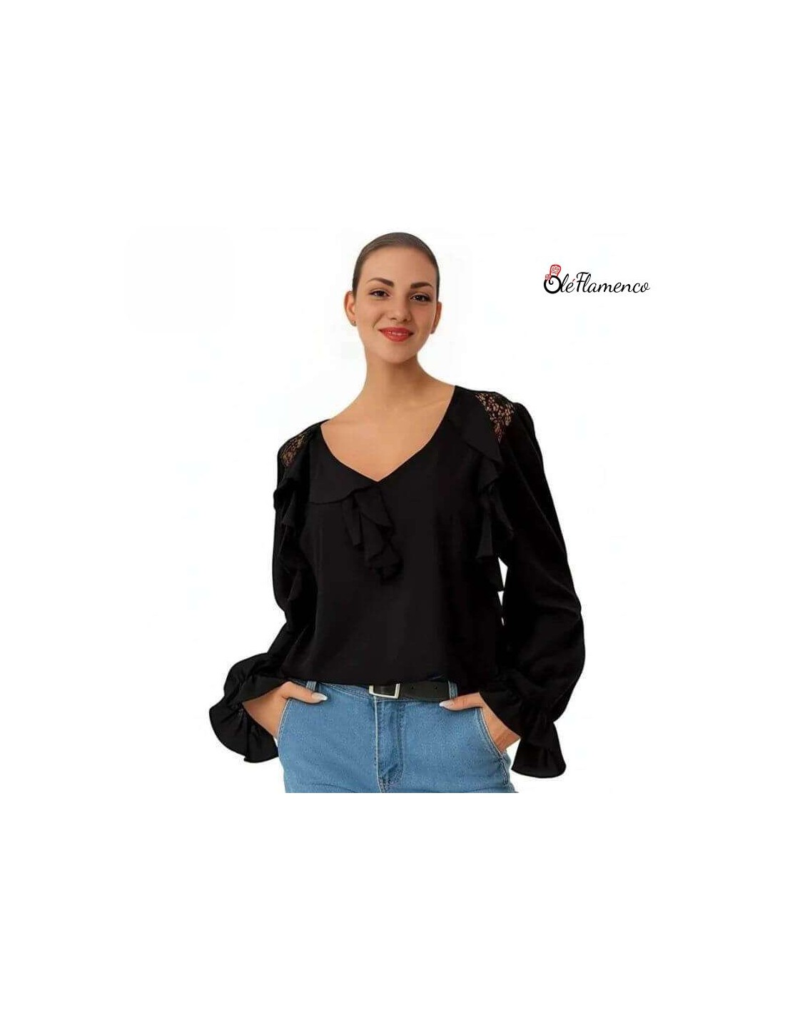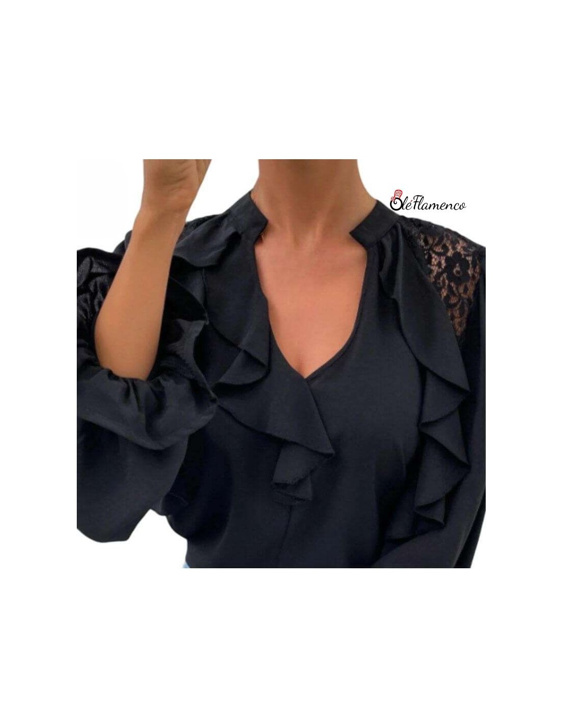 Esta elegante blusa de mujer destaca por sus volantes en la parte delantera y en las sisas, y por los delicados adornos de encaje en los hombros en color negro.