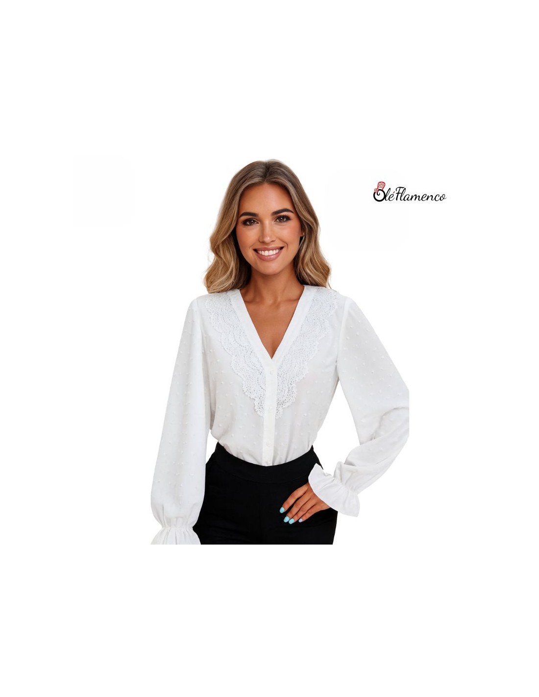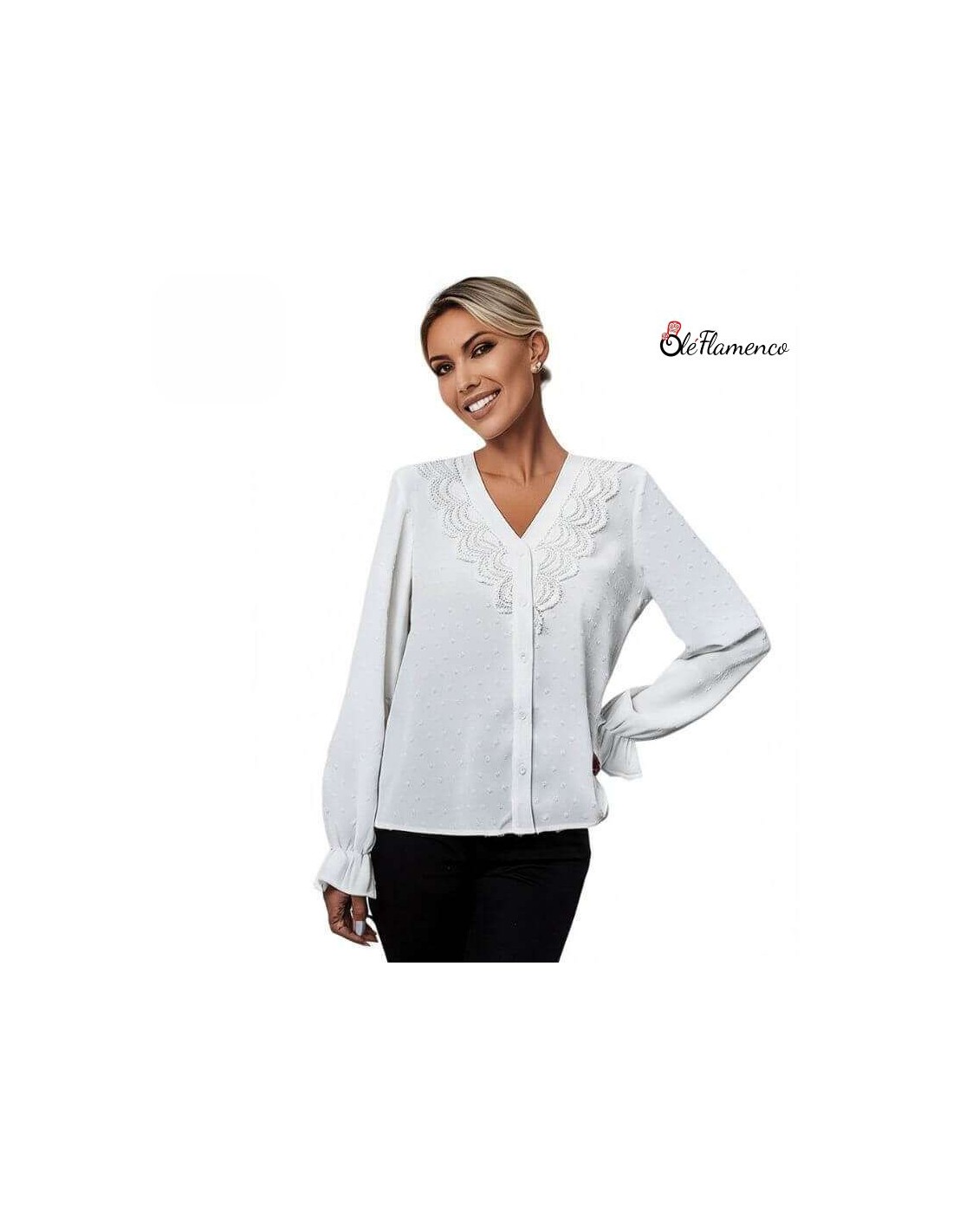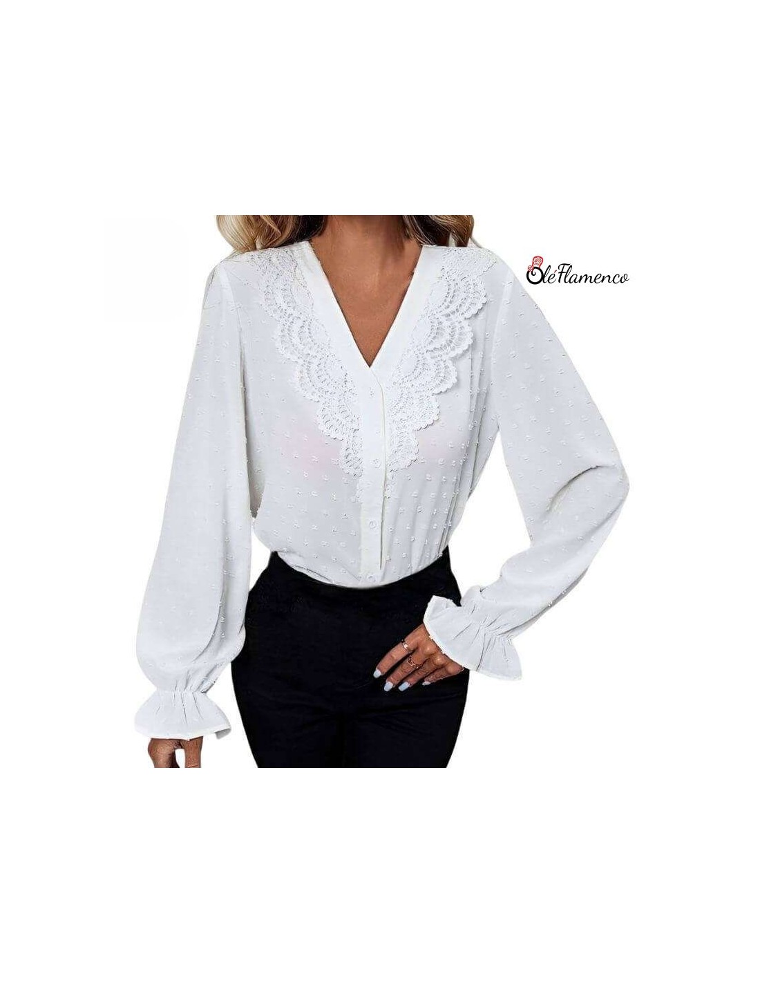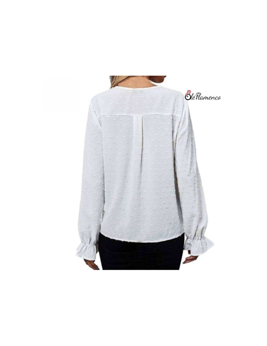 Blusa Flamenca cuello en pico sin solapa con tela de tops sobrepuestos y detalles de tira bordada en la parte delantera. Mangas largas con volante y fuelle en la parte trasera.