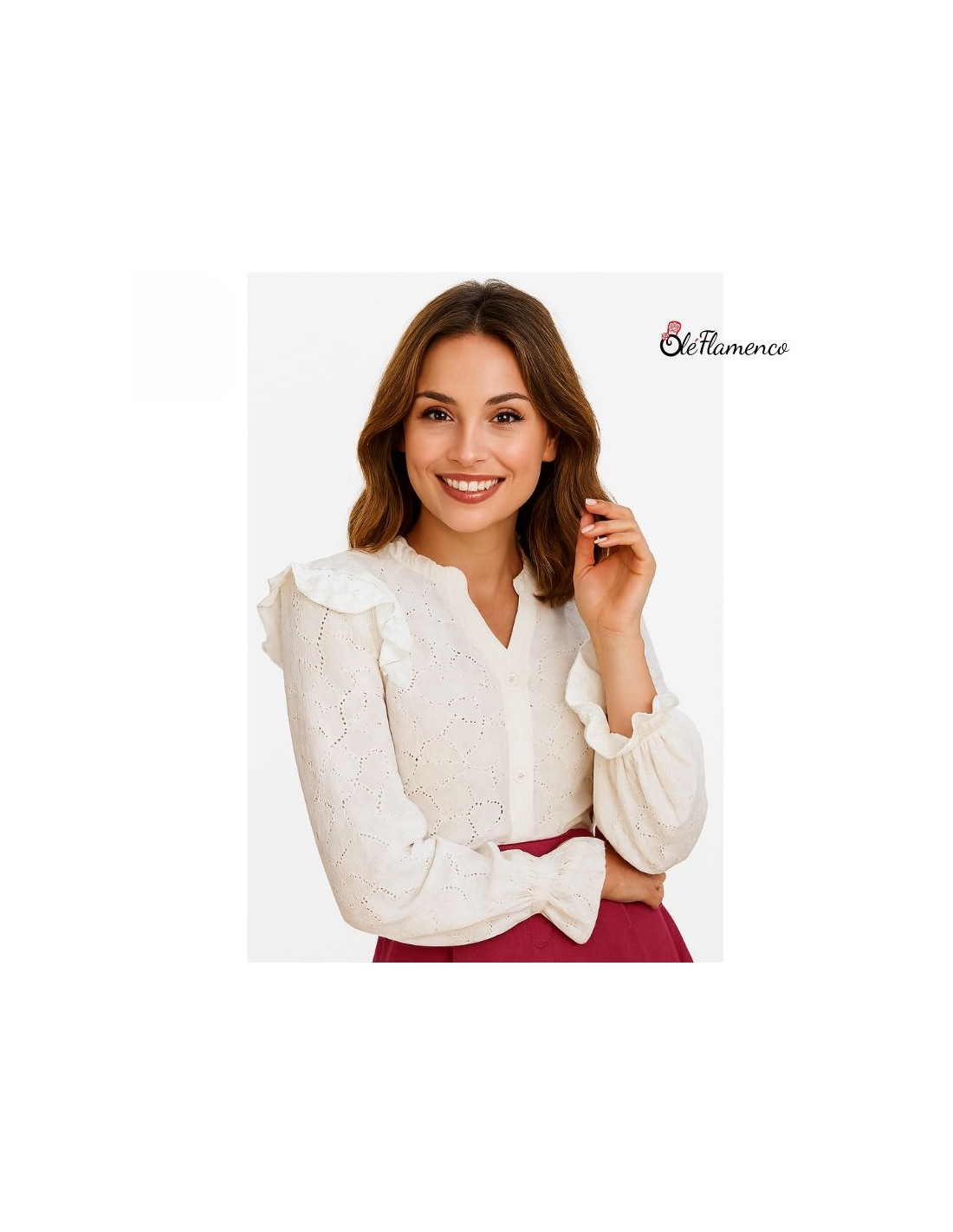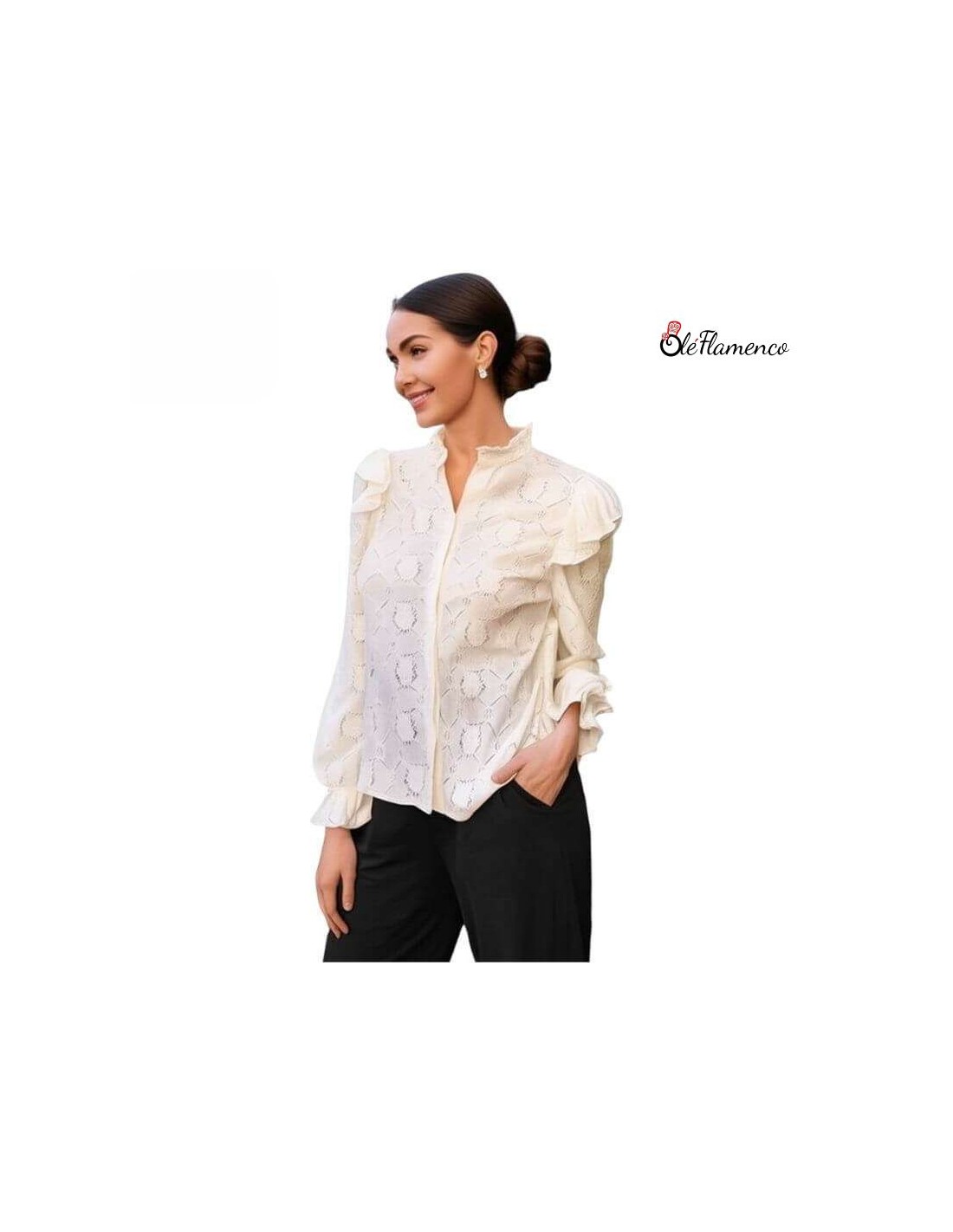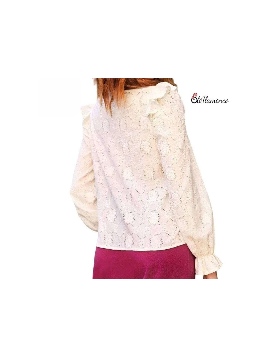 lusa en color beige con un original estampado. Confeccionada en tela semi transparente con elasticidad, presenta volantes en hombros, las mangas largas terminadas en un volante, añadiendo un toque flamenco y moderno. Talla única.