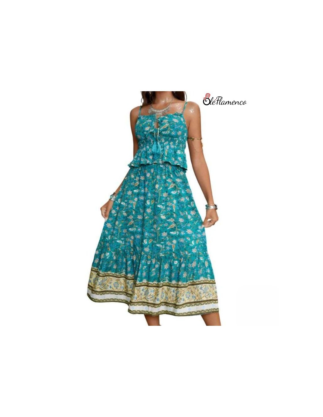 Falda de corte sirena confeccionada en tejido elástico ligero que realza la silueta sin perder comodidad. Su diseño floral y el vuelo final aportan movimiento y presencia, perfecto para estilismos flamencos.