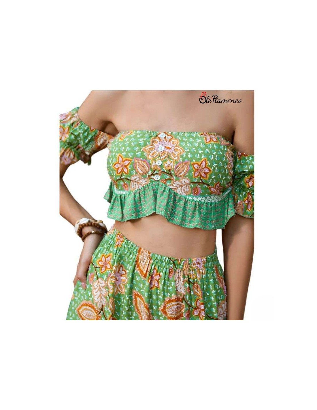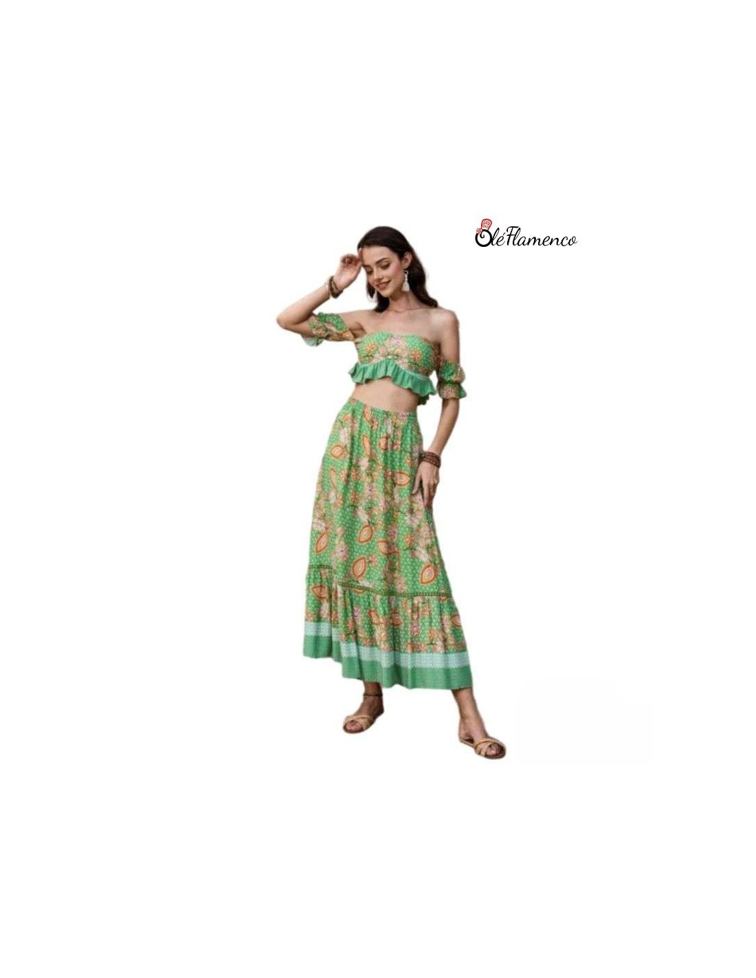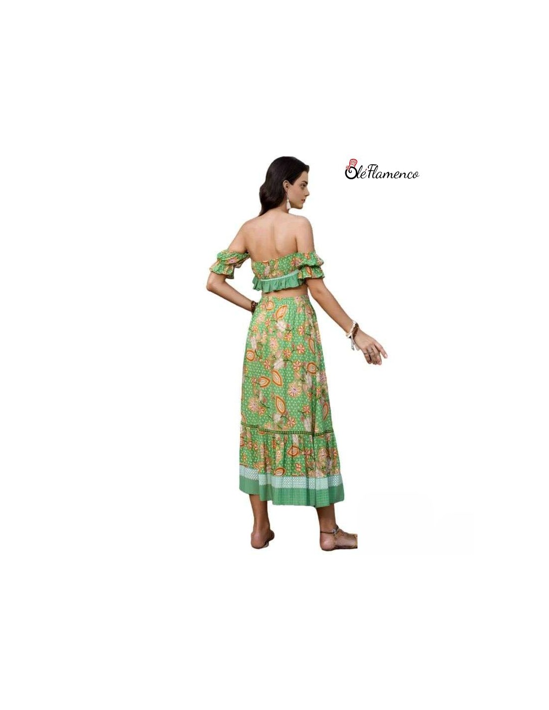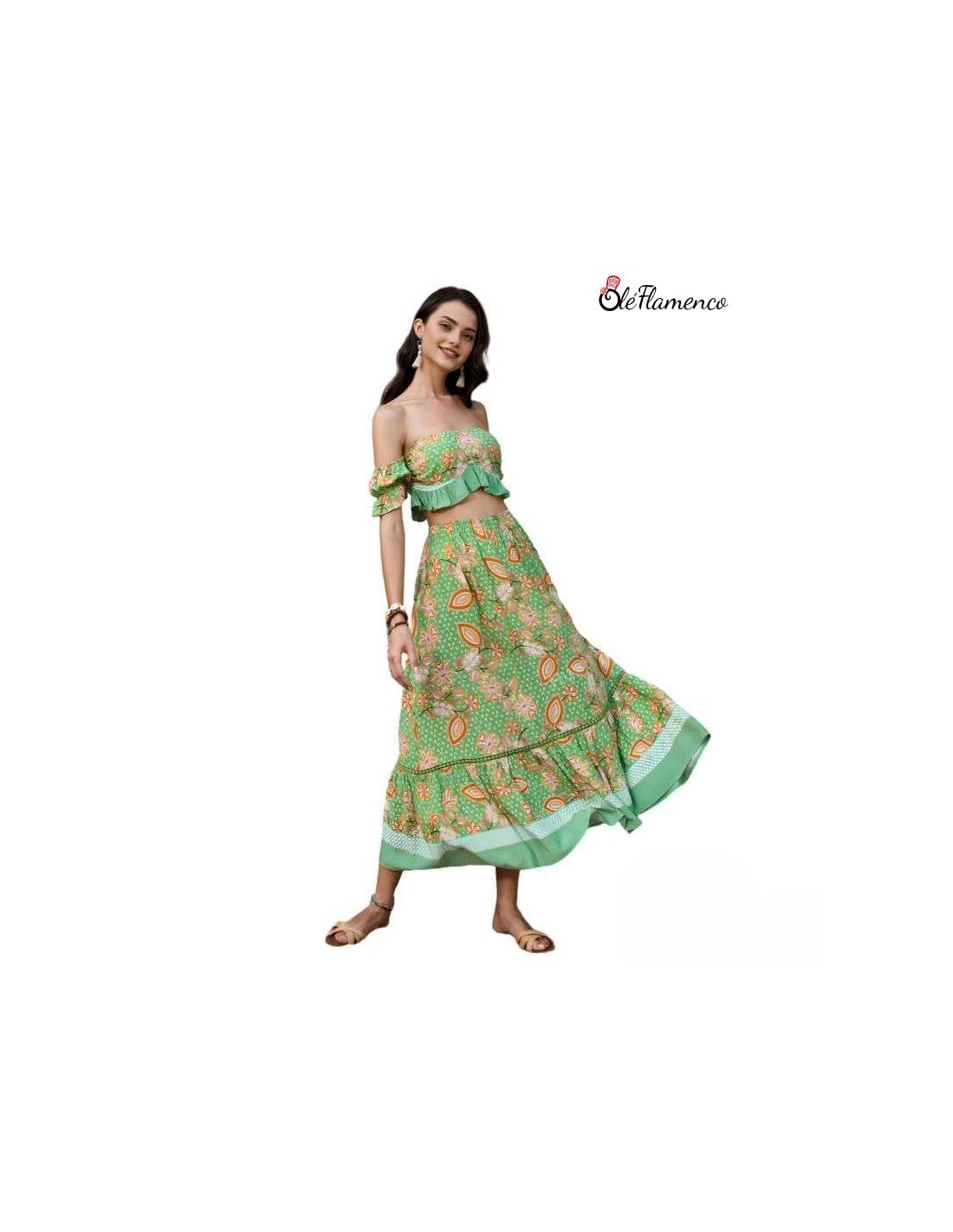 Nuestra falda de baile flamenco cuenta con una cintura alta que se puede girar para crear un efecto canesú. Entallada a medio muslo, tiene un corte con franja y un volante grande que da un vuelo de capa abajo. Esta falda de flamenco está combinada en licra estampada y lisa, lo que la hace una falda original y muy flamenca.