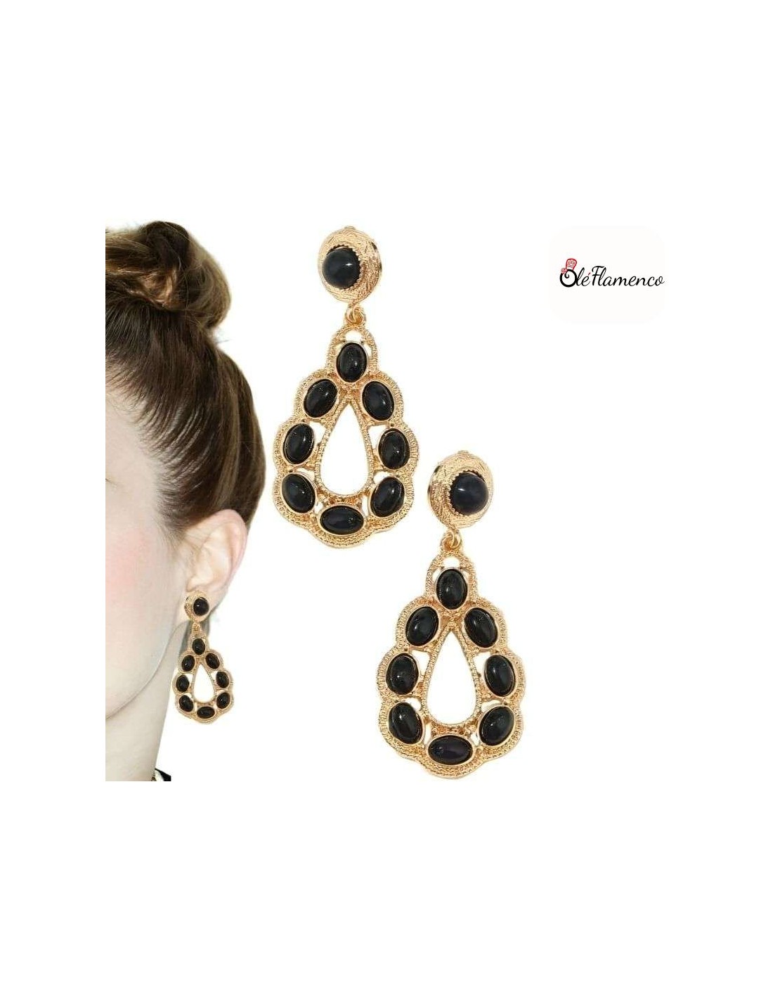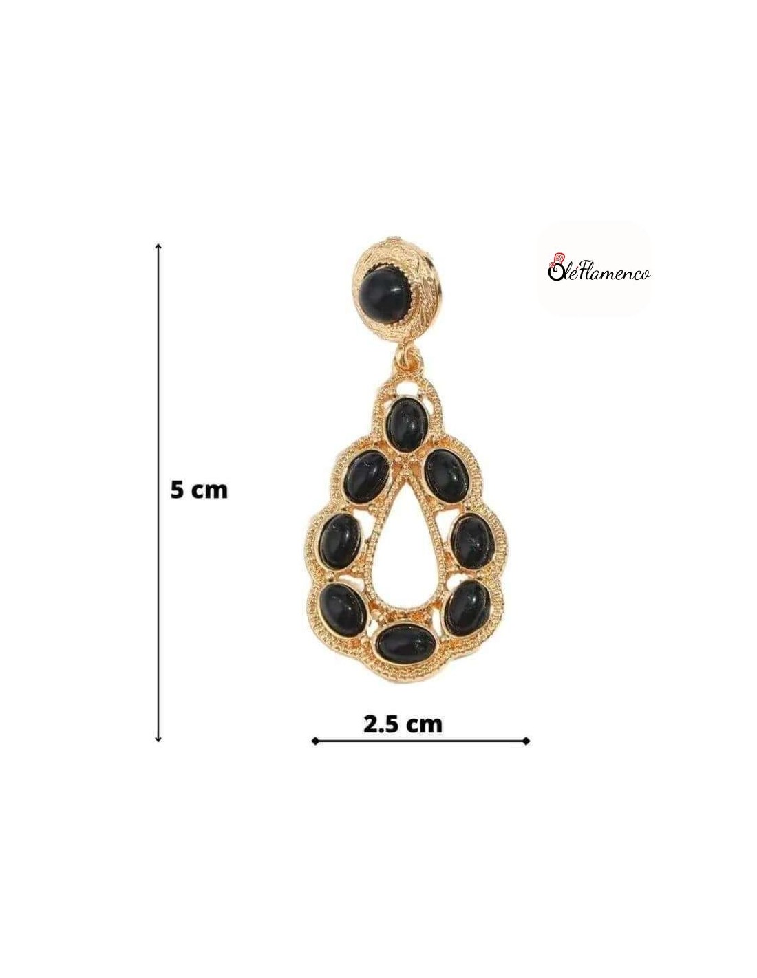 Pendientes de flamenca gota de agua con diseño de piedra negro con el dorado que los hace perfectos para complementar cualquier atuendo flamenco.