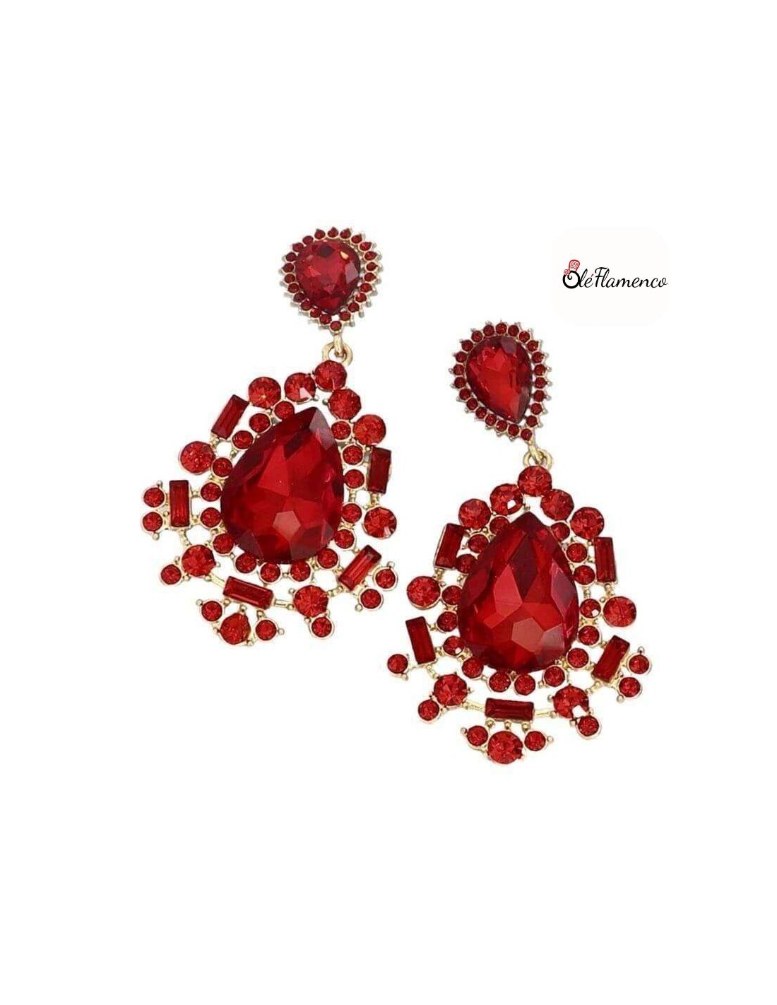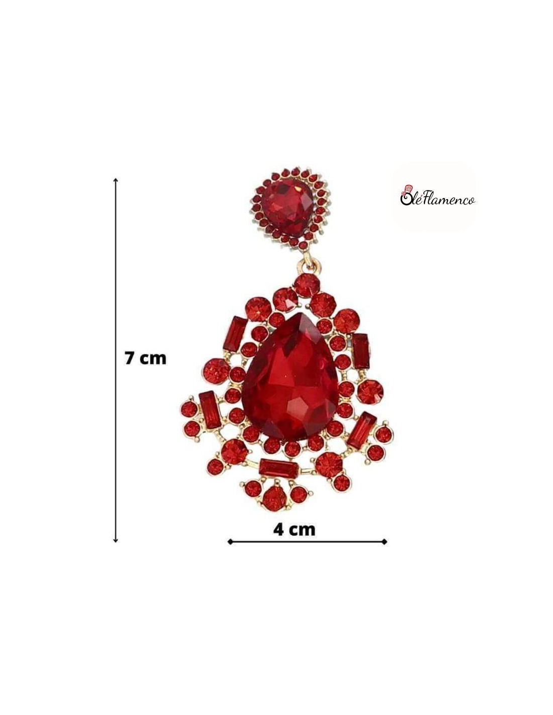Pendientes de flamenca rojos de imitación de diamante. Con una gran lágrima central rodeada de diamantes de imitación pequeños.