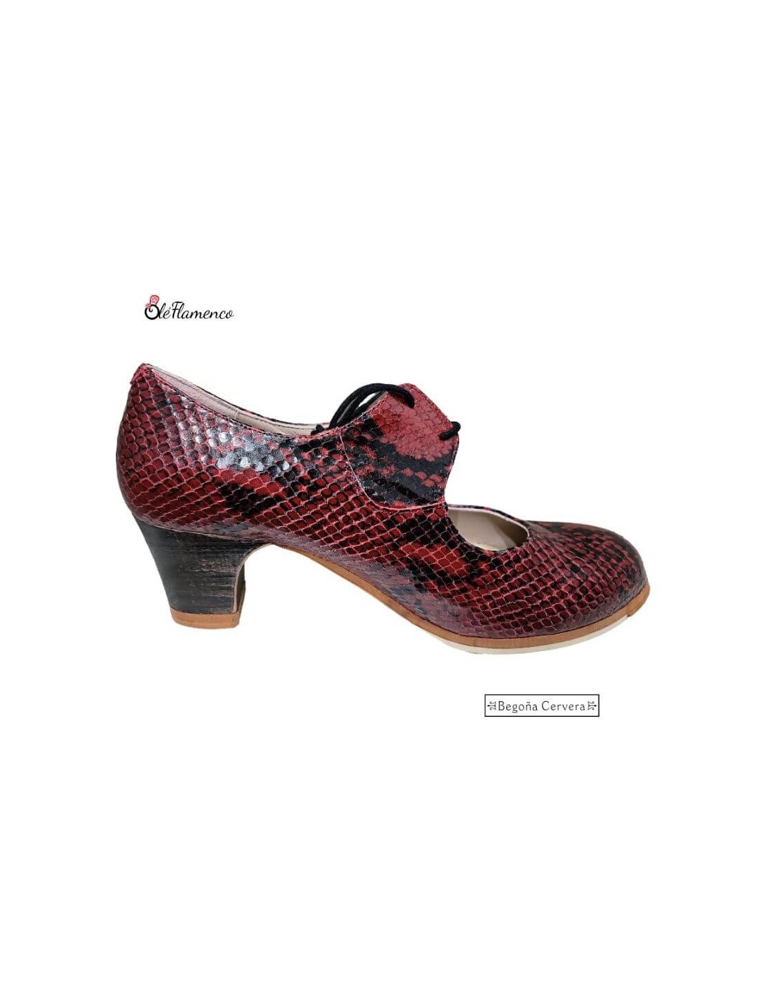 Zapato profesional de baile flamenco Begoña Cervera. Diseño de alta gama confeccionado en piel con un sofisticado grabado de serpiente en color rojo y negro. Incorpora cierre por cordones para un ajuste milimétrico y un tacón carrete de madera oscura, combinando una estética agresiva y elegante con la máxima respuesta técnica en el zapateado.