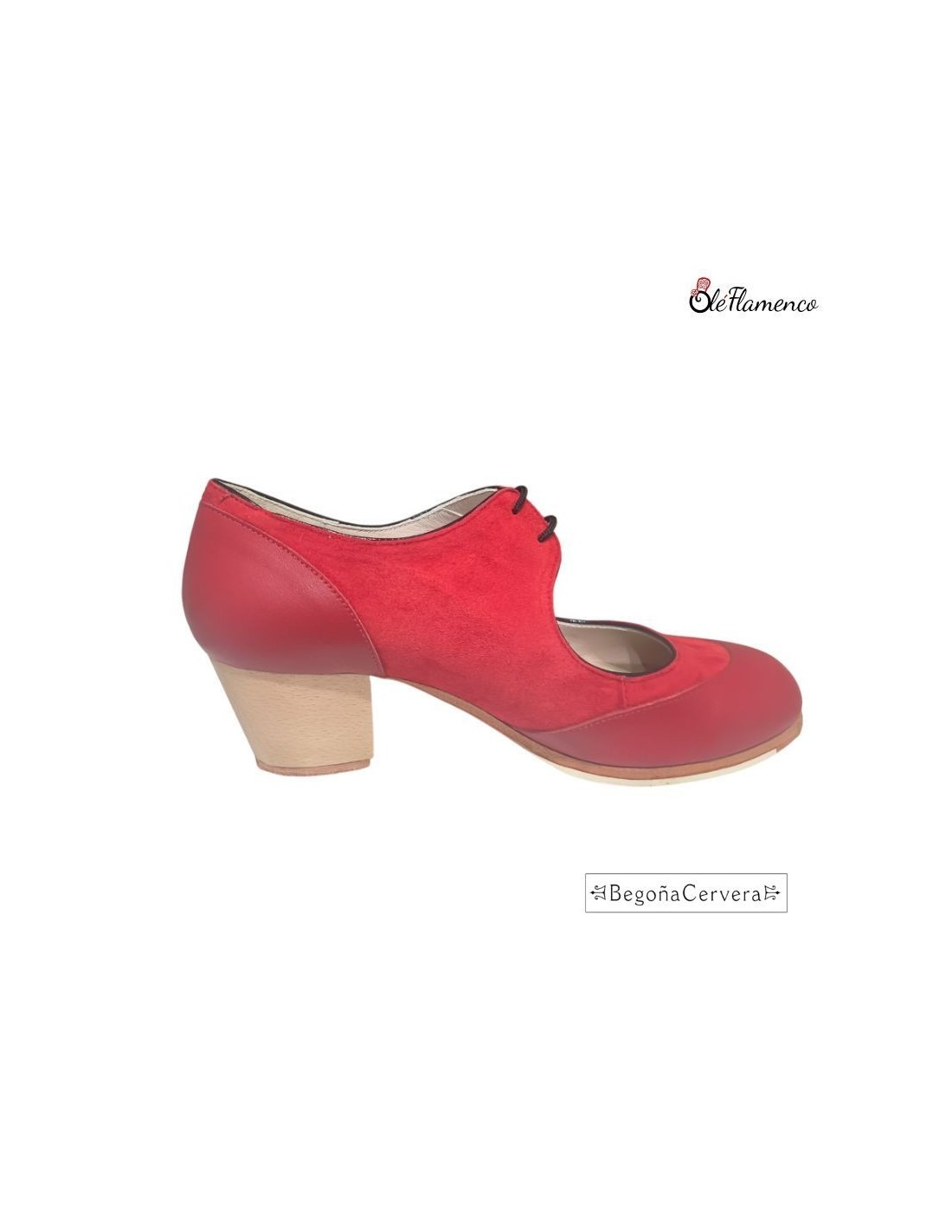 Zapato profesional de baile flamenco Begoña Cervera. Diseño técnico que combina la durabilidad de la piel roja con la flexibilidad del ante rojo. Este modelo incorpora un cierre por cordones para un ajuste milimétrico y un tacón cubano de madera lacada, ideal para bailaoras que buscan la máxima estabilidad y un sonido seco y potente en el zapateado.